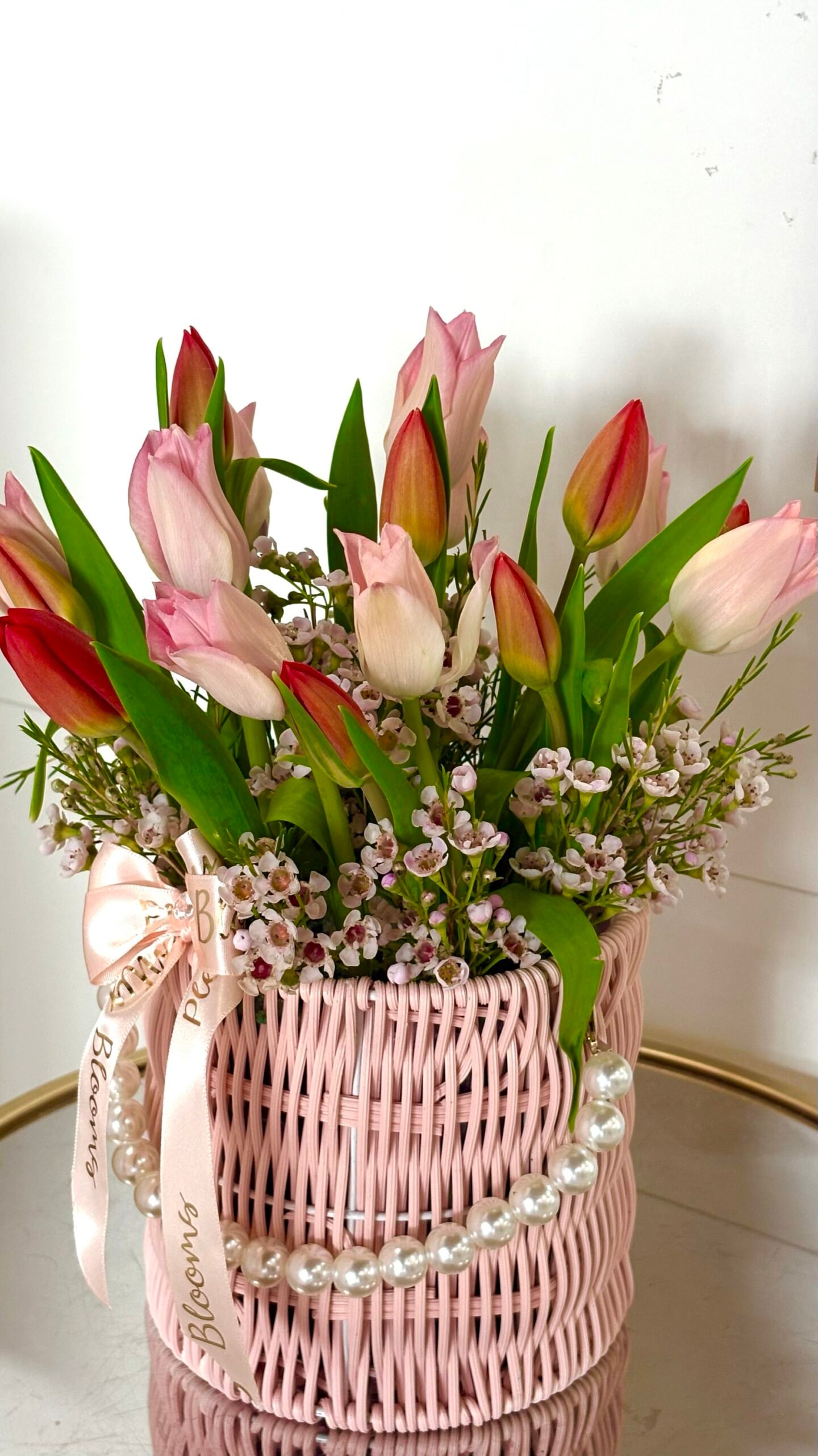 Un delicado encuentro entre la pureza del blanco y la dulzura del rosa. Este arreglo de tulipanes transmite amor sincero, ternura y elegancia en cada tallo.