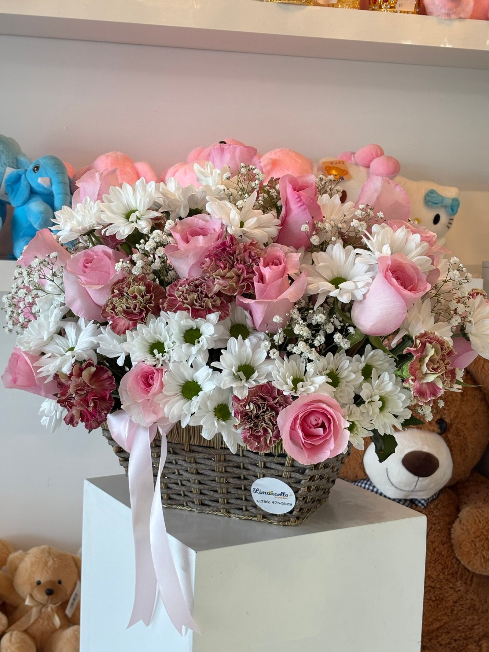 A gentle expression of beauty and sweetness — this light pink basket overflows with a dreamy mix of roses and daisies, delicately arranged to evoke tenderness and joy. Perfect for brightening someone’s day, celebrating love, or simply saying “you’re special” with timeless elegance.