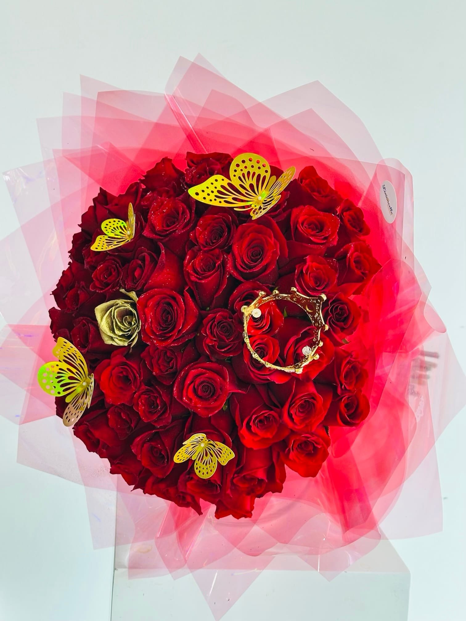 Our 5 red dozens of red roses bouquet bring the elegance and passion of this magnificent bouquet with a gold roses and touch of butterflies will impress your special someone