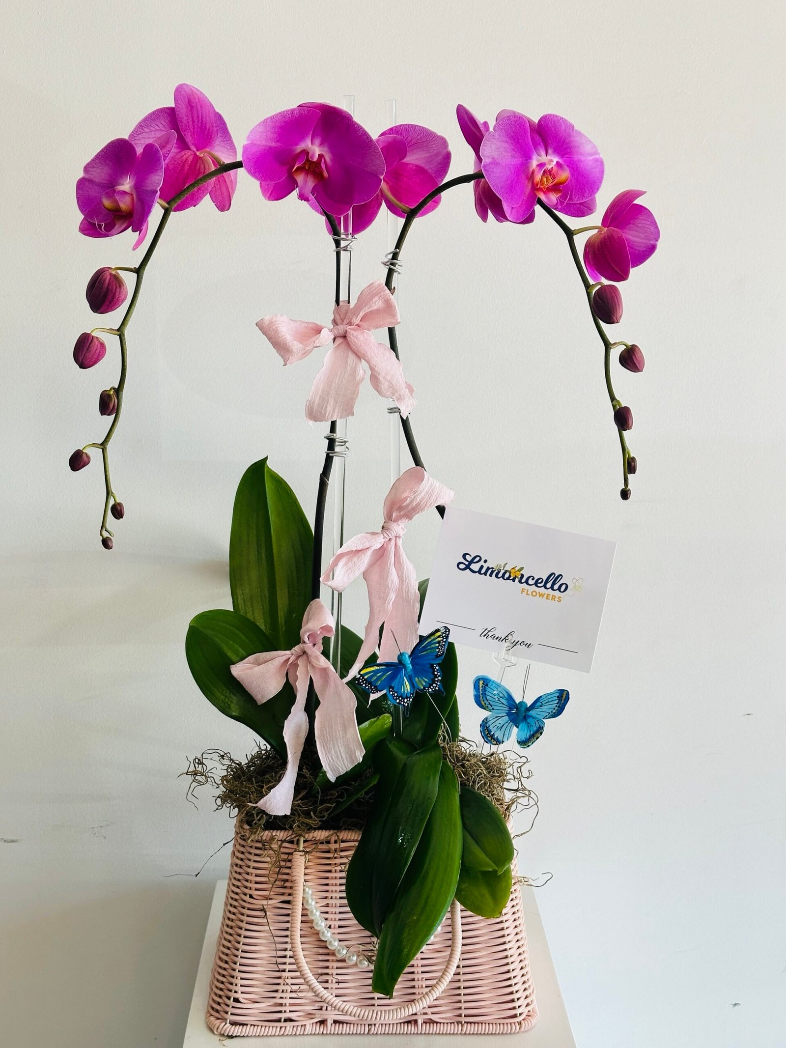 This stunning arrangement features the soft, captivating beauty of pink orquids, their delicate petals radiating elegance and grace