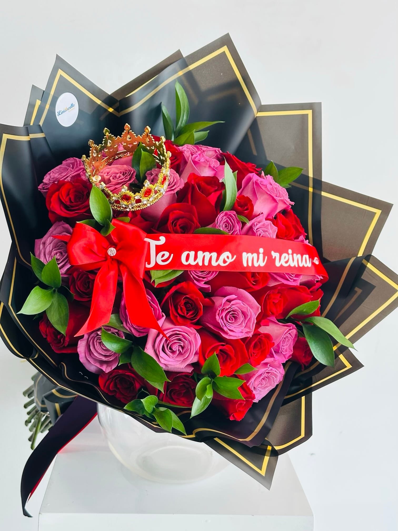 The bouquet features a striking combination of deep purple and vibrant red blooms, creating a stunning visual contrast.