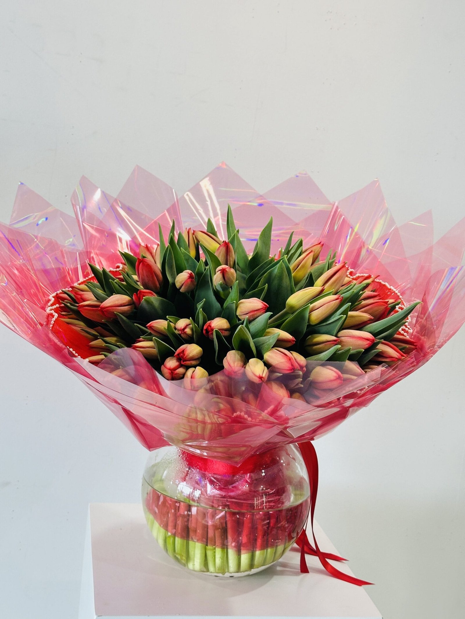 Experience the allure of love with our Passionate Petals Bouquet, a stunning arrangement of vibrant red tulips. Each bloom, with its velvety texture and graceful, curving petals, symbolizes deep affection and romance.
