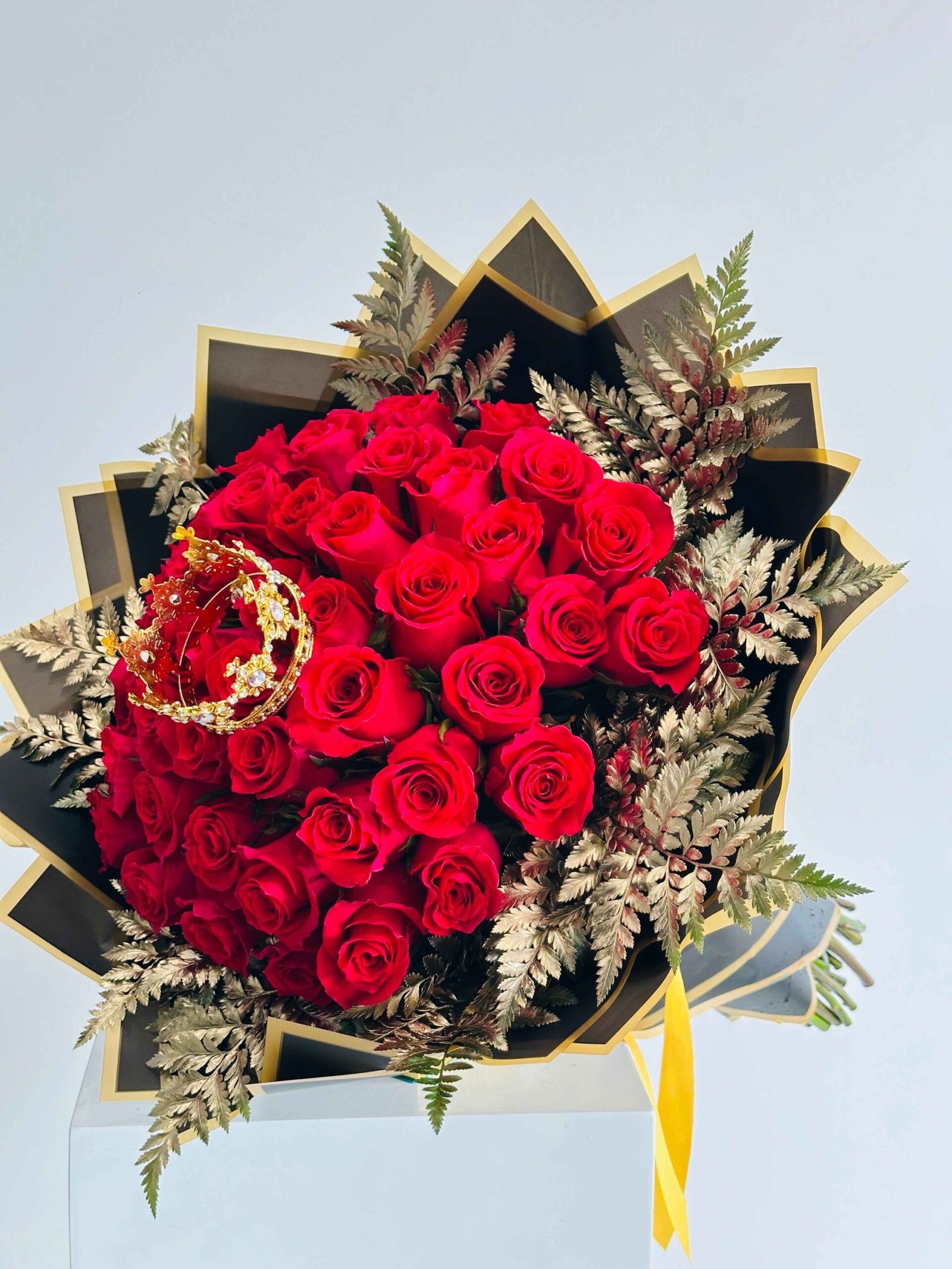 50 long stem hot pink roses with leather leaf and a elegant gold crown