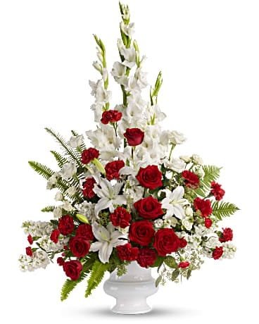 In a serene union of purity and love, our red and white flower arrangement tenderly conveys condolences and remembrance. Majestic crimson roses, representing deep respect and admiration, intertwine gracefully with pristine white lilies, symbolizing the purity of the departed soul. Delicate accents of white hydrangeas and carnations add softness and sincerity to the composition, creating a tableau of grace and tranquility. Lush green eucalyptus leaves and ivy cascade gently, symbolizing eternal life and renewal. This harmonious arrangement embodies the enduring bond of love and the purity of cherished memories, offering solace and comfort during this time of reflection and farewell