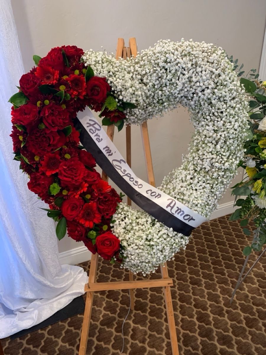 A heart-shaped funeral arrangement designed with a blend of rich red and pure white flowers, symbolizing deep love, respect, and the purity of remembrance. The striking contrast between the bold red blooms and the soft white petals creates a beautiful tribute to a life filled with affection and cherished memories. This heartfelt display serves as a comforting and meaningful gesture, offering solace to those who mourn while honoring the love shared with the departed. The arrangement embodies both passion and peace, making it a fitting tribute for a loved one.