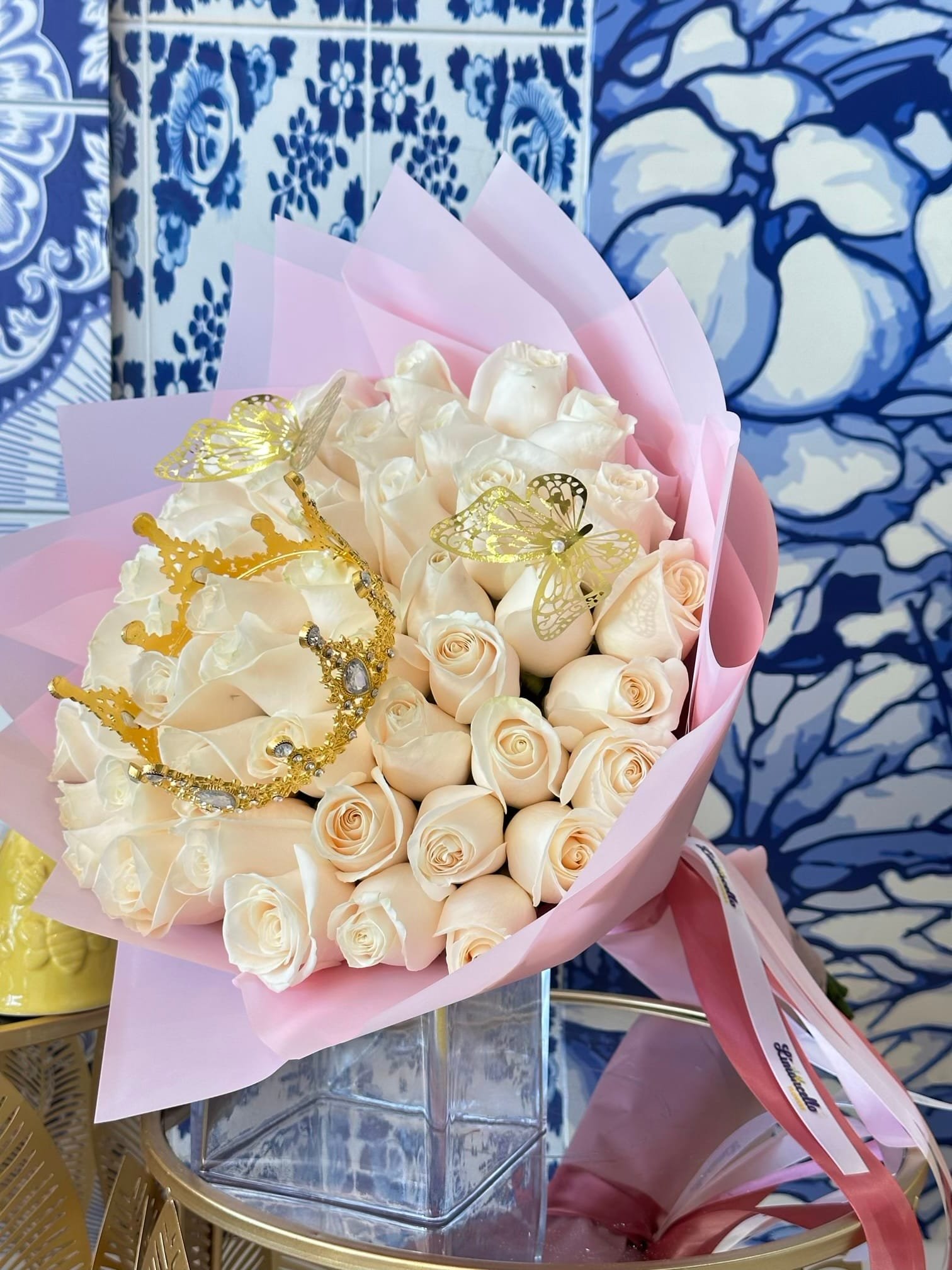 Experience this beautiful white roses bouquet (4 dozens) with the elegance of a gold crown and touch of butterflies bring that perfect preset for that special someone.